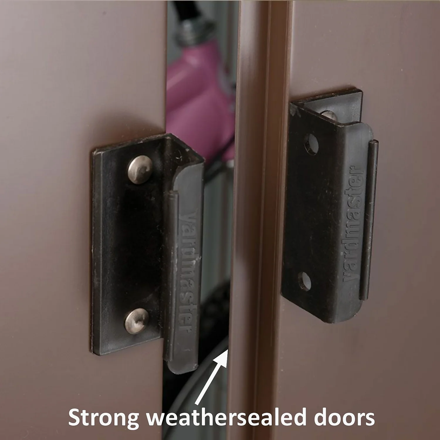 The Yardmaster Woodgrain metal shed 6ft x 6ft has double sliding doors and wood effect cladding which blends into garden settings